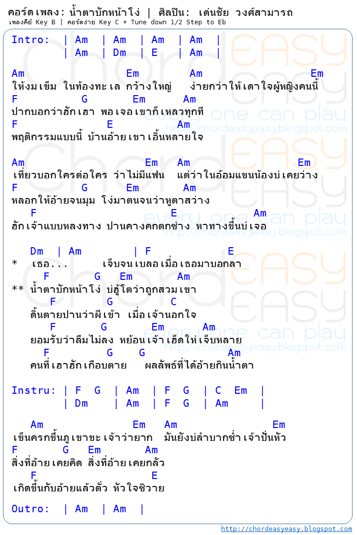 ********************************************************** ติดตามเพลงใหม่ๆ อัพเดททุกวันทาง fb.com/chordeasyeasy และทาง Twitter @ChordEasyEasy ********************************************************** Intro: | Am | Am | Am | Am | | Am | Dm | E | Am | Am Em ให้งมเข็ม ในท้องทะเล กว้างใหญ่ Am Em ง่ายกว่าให้เดาใจผู้หญิงคนนี้ F G Em Am ปากบอกว่าฮักเฮา พอเจอเขาก็เหลวทุกที F E Am พฤติกรรมแบบนี้ บ้านอ้ายเขาเอิ้นหลายใจ Am Em เที่ยวบอกใครต่อใคร ว่าไม่มีแฟน Am Em แต่ว่าในอ้อมแขนน้องบ่เคยว่าง F G Em Am หลอกให้อ้ายจนมุม โง่มาตนจนว่าหูตาสว่าง F E Am ฮักเจ้าแบบหลงทาง ปานคางคกตกซ่าง หาทางขึ้นบ่เจอ Dm | Am | F E * เธอ... เจ็บจนเบลอเมื่อเธอมาบอกลา F G Em Am ** น้ำตาบักหน้าโง่ บ่ฮู้โตว่าถูกสวมเขา F G C ดิ้นตายปานว่าผีเข้า เมื่อเจ้านอกใจ F G Em Am ยอมรับว่าลืมไม่ลง หย้อนเจ้าเฮ็ดให่เจ็บหลาย F G G Am คนที่เฮาฮักเกือบตาย ผลลัพธ์ที่ได้อ้ายกินน้ำตา Instru: | F G | Am | F G | C Em | | Dm | Am | F G | Am | Am Em เข็นครกขึ้นภูเขาขะเจ้าว่ายาก Am Em มันยังบ่ลำบากซ่ำเจ้าปั่นหัว F G Em Am สิ่งที่อ้ายเคยคิด สิ่งที่อ้ายเคยกลัว F E เกิดขึ้นกับอ้ายแล้วตั่ว หัวใจซิวาย Dm | Am | F E * เธอ... เจ็บจนเบลอเมื่อเธอมาบอกลา F G Em Am ** น้ำตาบักหน้าโง่ บ่ฮู้โตว่าถูกสวมเขา F G C ดิ้นตายปานว่าผีเข้า เมื่อเจ้านอกใจ F G Em Am ยอมรับว่าลืมไม่ลง หย้อนเจ้าเฮ็ดให่เจ็บหลาย F G Am คนที่เฮาฮักเกือบตาย ผลลัพธ์ที่ได้อ้ายกินน้ำตา Outro: | Am | Am |