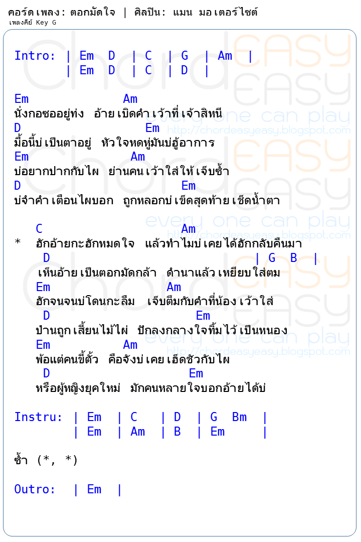 ********************************************************** ติดตามเพลงใหม่ๆ อัพเดททุกวันทาง fb.com/chordeasyeasy และทาง Twitter @ChordEasyEasy ********************************************************** Intro: | Em D | C | G | Am | | Em D | C | D | Em Am นั่งกอซออยู่ท่ง อ้ายเบิดคำเว้าที่เจ้าสิหนี D Em มื้อนี้บ่เป็นตาอยู่ หัวใจหดหู่มันบ่ฮู้อาการ Em Am บ่อยากปากกับไผ ย่านคนเว้าใส่ให้เจ็บซ้ำ D Em บ่จำคำเตือนไผบอก ถูกหลอกบ่เข็ดสุดท้ายเช็ดน้ำตา C Am * ฮักอ้ายกะฮักหมดใจ แล้วทำไมบ่เคยได้ฮักกลับคืนมา D | G B | เห็นอ้ายเป็นตอกมัดกล้า ดำนาแล้วเหยียบใส่ตม Em Am ฮักจนจนบ่โดนกะลืม เจ็บตึมกับคำที่น้องเว้าใส่ D Em ป่านถูกเสี้ยนไม้ไผ่ ปักลงกลางใจทิ้มไว้เป็นหนอง Em Am พ้อแต่คนขี้ตั้ว คือจังบ่เคยเฮ็ดชัวกับไผ D Em หรือผู้หญิงยุคใหม่ มักคนหลายใจบอกอ้ายได้บ่ Instru: | Em | C | D | G Bm | | Em | Am | B | Em | C Am * ฮักอ้ายกะฮักหมดใจ แล้วทำไมบ่เคยได้ฮักกลับคืนมา D | G B | เห็นอ้ายเป็นตอกมัดกล้า ดำนาแล้วเหยียบใส่ตม Em Am ฮักจนจนบ่โดนกะลืม เจ็บตึมกับคำที่น้องเว้าใส่ D Em ป่านถูกเสี้ยนไม้ไผ่ ปักลงกลางใจทิ้มไว้เป็นหนอง Em Am พ้อแต่คนขี้ตั้ว คือจังบ่เคยเฮ็ดชัวกับไผ D Em หรือผู้หญิงยุคใหม่ มักคนหลายใจบอกอ้ายได้บ่ C Am * ฮักอ้ายกะฮักหมดใจ แล้วทำไมบ่เคยได้ฮักกลับคืนมา D | G B | เห็นอ้ายเป็นตอกมัดกล้า ดำนาแล้วเหยียบใส่ตม Em Am ฮักจนจนบ่โดนกะลืม เจ็บตึมกับคำที่น้องเว้าใส่ D Em ป่านถูกเสี้ยนไม้ไผ่ ปักลงกลางใจทิ้มไว้เป็นหนอง Em Am พ้อแต่คนขี้ตั้ว คือจังบ่เคยเฮ็ดชัวกับไผ D Em หรือผู้หญิงยุคใหม่ มักคนหลายใจบอกอ้ายได้บ่ Outro: | Em |