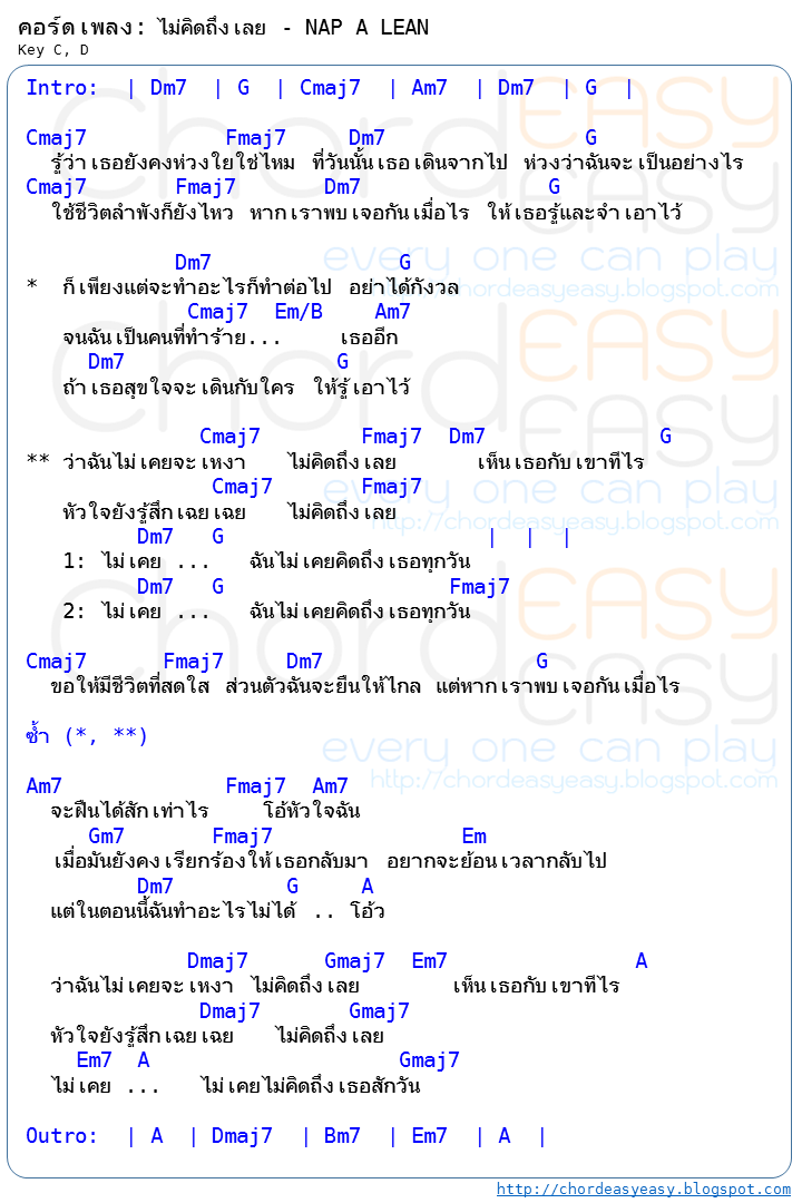 คอร์ดเพลง: ไม่คิดถึงเลย | ศิลปิน: NAP A LEAN