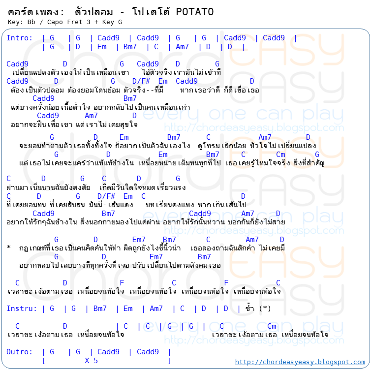 * เพลงตามใน MV พี่ปั๊บ Potato จูนสายลงมาเป็น Eb แล้วเล่น Key B