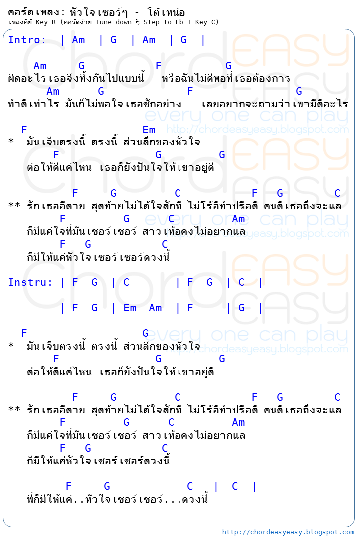 คอร์ดเพลง: หัวใจเซอร์ๆ | ศิลปิน: โต๋เหน่อ | คอร์ดง่าย | คอร์ด หัวใจเซอร์ๆ | คอร์ดเพลง | คอร์ดกีตาร์ | Ukulele | เนื้อร้อง | เนื้อเพลง หัวใจเซอร์ |