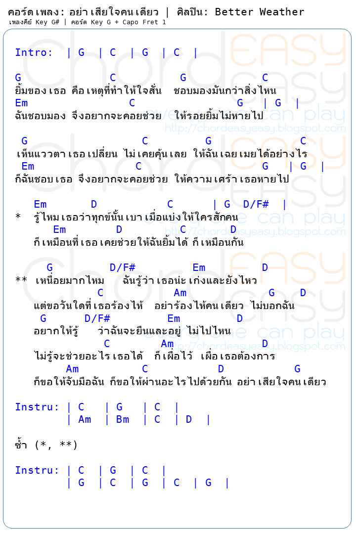 คอร์ดเพลง: อย่าเสียใจคนเดียว | ศิลปิน: Better Weather