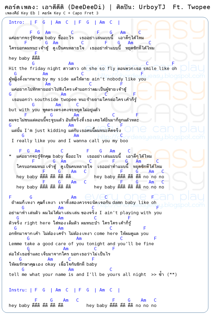 คอร์ดเพลง: เอาดีดีดิ (DeeDeeDi) | ศิลปิน: UrboyTJ Ft. Twopee | คอร์ดง่าย Key C คอร์ดวน | คอร์ด เอาดีดีดิ | คอร์ดเพลง เอาดีดีดิ | คอร์ดกีตาร์ | Ukulele | เนื้อร้อง | เนื้อเพลง เอาดีดีดิ | UrboyTJ Ft. Twopee