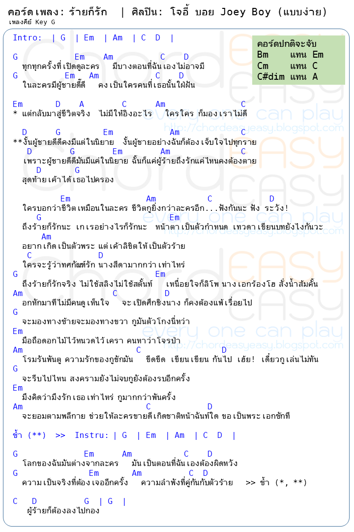 คอร์ดเพลง: ร้ายก็รัก | ศิลปิน: โจอี้ บอย Joey Boy | คอร์ดง่าย Key G | คอร์ด ร้ายก็รัก | | คอร์ดเพลง ร้ายก็รัก | คอร์ดกีตาร์ | Ukulele | เนื้อร้อง | เนื้อเพลง ร้ายก็รัก | โจอี้ บอย Joey Boy