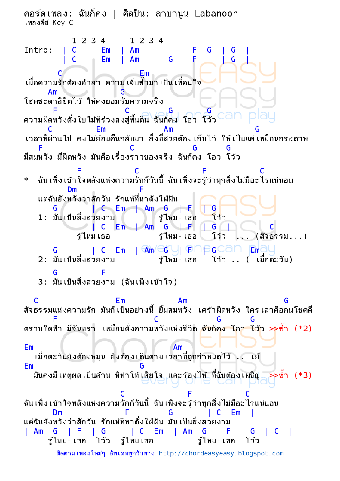 คอร์ดเพลง: ฉันก็คง | ศิลปิน: ลาบานูน Labanoon | คอร์ดง่ายๆ Key C | คอร์ด ฉันก็คง | คอร์ดเพลง ฉันก็คง | คอร์ดกีตาร์ | Ukulele | เนื้อร้อง | เนื้อเพลง ฉันก็คง | ลาบานูน Labanoon
