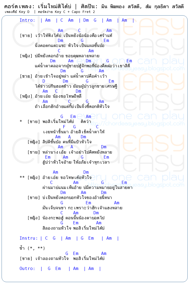 คอร์ดเพลง: เริ่มใหม่สิได้บ่ | ศิลปิน: มิน พิณทอง สวัสดี, ส้ม กุลธิดา สวัสดี