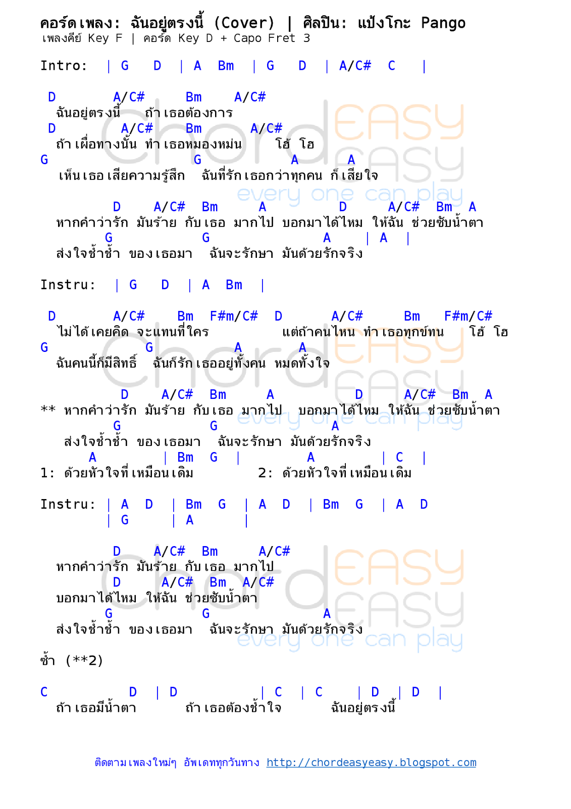 คอร์ดเพลง: ฉันอยู่ตรงนี้ (Cover) | ศิลปิน: แป้งโกะ Pango | คอร์ดง่ายๆ Key D |
