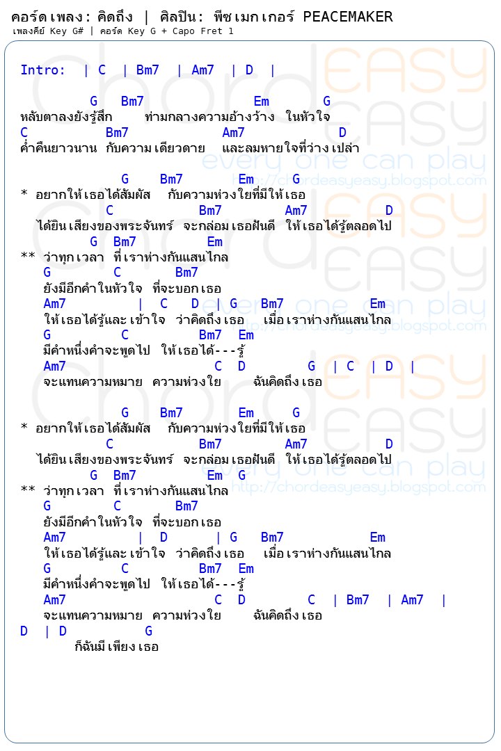 คอร์ดเพลง: คิดถึง | ศิลปิน: พีซ เมกเกอร์ PEACEMAKER | คอร์ดง่าย Key G | คอร์ด คิดถึง | พีซ เมกเกอร์ PEACEMAKER | คอร์ดเพลง คิดถึง | คอร์ดกีตาร์ | Ukulele | เนื้อร้อง | เนื้อเพลง คิดถึง | พีซ เมกเกอร์ PEACEMAKER