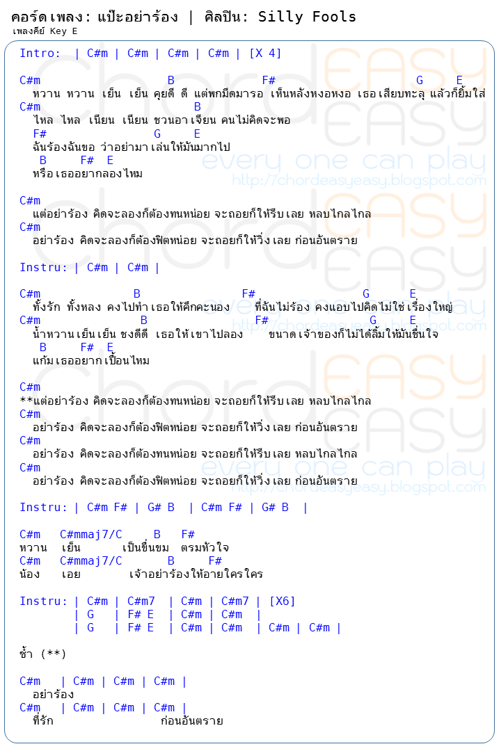 คอร์ดเพลง: แป๊ะอย่าร้อง | ศิลปิน: Silly Fools | คอร์ด แป๊ะอย่าร้อง | Silly Fools | คอร์ดเพลง แป๊ะอย่าร้อง | คอร์ดกีตาร์ | Ukulele | เนื้อร้อง | เนื้อเพลง แป๊ะอย่าร้อง | Silly Fools