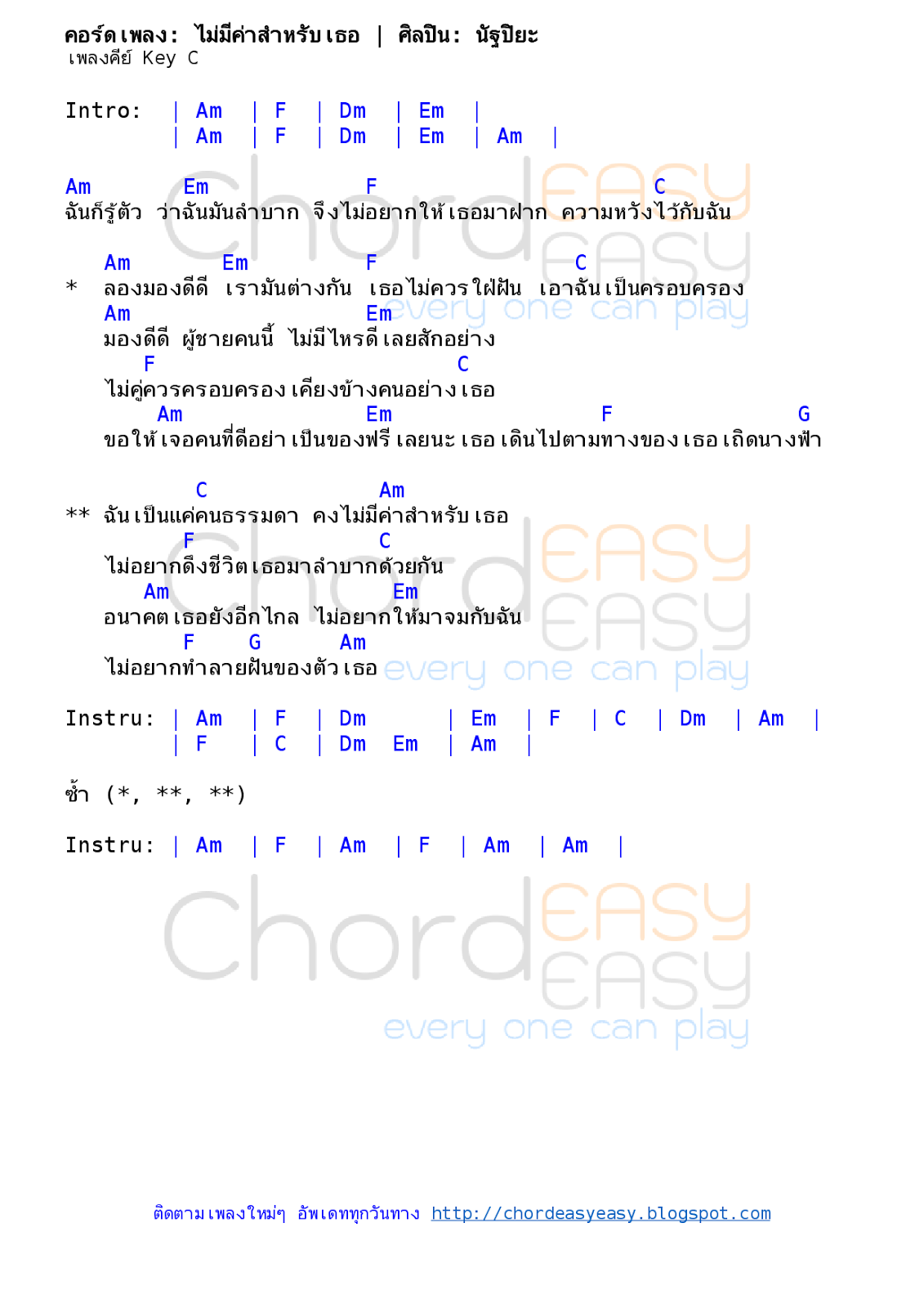 คอร์ดเพลง: ไม่มีค่าสำหรับเธอ | ศิลปิน: นัฐปิยะ | คอร์ดง่ายๆ Key C |