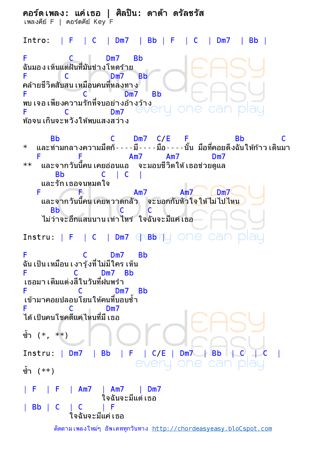 คอร์ดเพลง: แค่เธอ | ศิลปิน: ดาต้า ดรัลชรัส | คอร์ดง่ายๆ Key C |