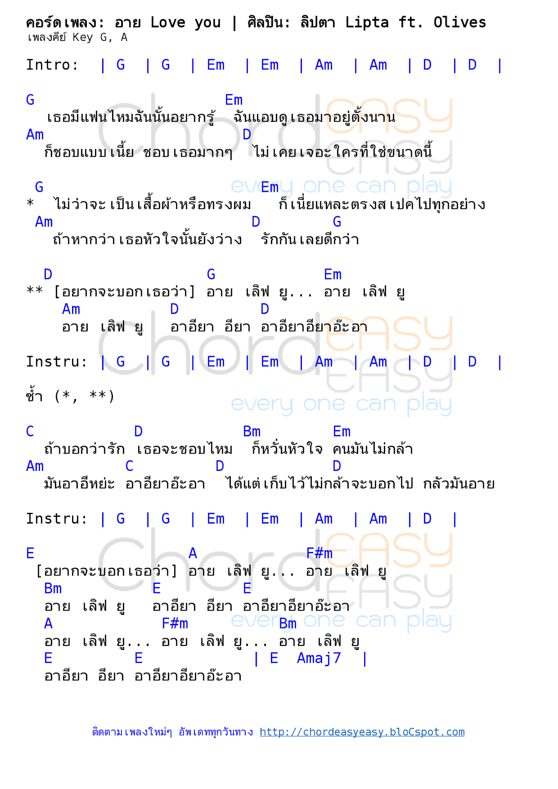 คอร์ดเพลง: อาย Love you | ศิลปิน: ลิปตา Lipta ft. Olives | คอร์ดง่ายๆ Key G, A |