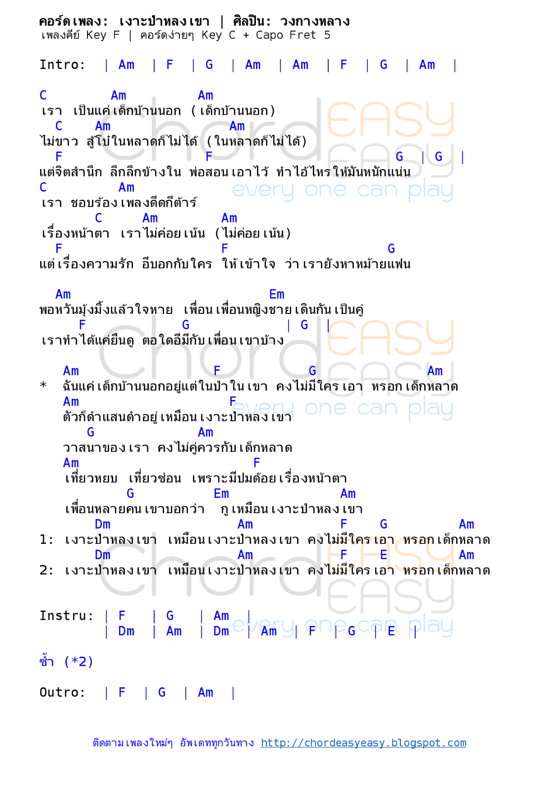 ********************************************************** ติดตามเพลงใหม่ๆ อัพเดททุกวันทาง fb.com/chordeasyeasy และทาง Twitter @ChordEasyEasy ********************************************************** Intro: | Dm | Bb | C | Dm | Dm | Bb | C | Dm | F Dm Dm เรา เป็นแค่เด็กบ้านนอก (เด็กบ้านนอก) F Dm Dm ไม่ขาว สู้โบ๋ในหลาดก็ไม่ได้ (ในหลาดก็ไม่ได้) Bb Bb C | C | แต่จิตสำนึก ลึกลึกข้างใน พ่อสอนเอาไว้ ทำไอ้ไหรให้มันหนักแน่น F Dm เรา ชอบร้องเพลงดีดกีต้าร์ F Dm Dm เรื่องหน้าตา เราไม่ค่อยเน้น (ไม่ค่อยเน้น) Bb Bb C แต่เรื่องความรัก อีบอกกับใคร ให้เข้าใจ ว่าเรายังหาหม้ายแฟน Dm Am พอหวันมุ้งมิ้งแล้วใจหาย เพื่อนเพื่อนหญิงชายเดินกันเป็นคู่ Bb C | C | เราทำได้แค่ยืนดู ตอใดอีมีกับเพื่อนเขาบ้าง Dm Bb C Dm ฉันแค่เด็กบ้านนอกอยู่แต่ในป่าในเขา คงไม่มีใครเอา หรอกเด็กหลาด Dm Bb ตัวก็ดำแสนดำอยู่เหมือนเงาะป่าหลงเขา C Dm วาสนาของเรา คงไม่คู่ควรกับเด็กหลาด Dm Bb เที่ยวหยบ เที่ยวซ่อน เพราะมีปมด้อยเรื่องหน้าตา C Am Dm เพื่อนหลายคนเขาบอกว่า กูเหมือนเงาะป่าหลงเขา Gm Dm Bb C Dm เงาะป่าหลงเขา เหมือนเงาะป่าหลงเขา คงไม่มีใครเอา หรอกเด็กหลาด Instru: | Bb | C | Dm | | Gm | Dm | Gm | Dm | Bb | C | A | Dm Bb C Dm ฉันแค่เด็กบ้านนอกอยู่แต่ในป่าในเขา คงไม่มีใครเอา หรอกเด็กหลาด Dm Bb ตัวก็ดำแสนดำอยู่เหมือนเงาะป่าหลงเขา C Dm วาสนาของเรา คงไม่คู่ควรกับเด็กหลาด Dm Bb เที่ยวหยบ เที่ยวซ่อน เพราะมีปมด้อยเรื่องหน้าตา C Am Dm เพื่อนหลายคนเขาบอกว่า กูเหมือนเงาะป่าหลงเขา Gm Dm Bb A Dm เงาะป่าหลงเขา เหมือนเงาะป่าหลงเขา คงไม่มีใครเอา หรอกเด็กหลาด Outro: | Bb | C | Dm |