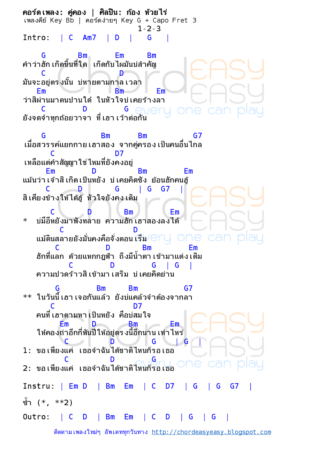 ********************************************************** ติดตามเพลงใหม่ๆ อัพเดททุกวันทาง fb.com/chordeasyeasy และทาง Twitter @ChordEasyEasy ********************************************************** 1-2-3 Intro: | C Am7 | D | G | G Bm Em Bm คำว่าฮักเกิดขึ้นที่ใด เกิดกับไผมันบ่สำคัญ C D มันจะอยู่ตรงนั้น บ่หายตามกาลเวลา Em Bm Em ว่าสิผ่านมาดนปานใด๋ ในหัวใจบ่เคยร้างลา C D G ยังจดจำทุกถ้อยวาจา ที่เฮาเว้าต่อกัน G Bm Bm G7 เมื่อสวรรค์แยกกายเฮาสอง จากคู่ครองเป็นคนอื่นไกล C D7 เหลือแต่คำสัญญาใช่ไหมที่ยังคงอยู่ Em D Bm Em แม้นว่าเจ้าสิเกิดเป็นหยัง บ่เคยคิดซัง ย้อนฮักคนฮู้ C D G | G G7 | สิเคียงข้างให้ได้ฮู้ หัวใจยังคงเดิม C D Bm Em * บ่มีอีหยังมาพังทลาย ความฮักเฮาสองลงได้ C D แม้ดินสลายยังมั่นคงคือจั่งตอนเริ่ม C D Bm Em ฮักที่แลก ด้วยแหกกฏฟ้า ถึงมีน้ำตาเข้ามาแต่งเติม C D G | G | ความปวดร้าวสิเข้ามาเสริม บ่เคยคิดย่าน G Bm Bm G7 ** ในวันนี้เฮาเจอกันแล้ว ยังบ่แคล้วจำต้องจากลา C D7 คนที่เฮาตามหาเป็นหยัง คือบ่สมใจ Em D Bm Em ให้คองถ่าอีกกี่พันปีให้อยู่ตรงนี้อีกนานเท่าไหร่ C D G | G | ขอเพียงแค่ เธอจำฉันได้ชาติไหนก็รอเธอ Instru: | Em D | Bm Em | C D7 | G | G G7 | C D Bm Em * บ่มีอีหยังมาพังทลาย ความฮักเฮาสองลงได้ C D แม้ดินสลายยังมั่นคงคือจั่งตอนเริ่ม C D Bm Em ฮักที่แลก ด้วยแหกกฏฟ้า ถึงมีน้ำตาเข้ามาแต่งเติม C D G | G | ความปวดร้าวสิเข้ามาเสริม บ่เคยคิดย่าน G Bm Bm G7 ** ในวันนี้เฮาเจอกันแล้ว ยังบ่แคล้วจำต้องจากลา C D7 คนที่เฮาตามหาเป็นหยัง คือบ่สมใจ Em D Bm Em ให้คองถ่าอีกกี่พันปีให้อยู่ตรงนี้อีกนานเท่าไหร่ C D G ขอเพียงแค่ เธอจำฉันได้ชาติไหนก็รอเธอ Outro: | C D | Bm Em | C D | G | G |