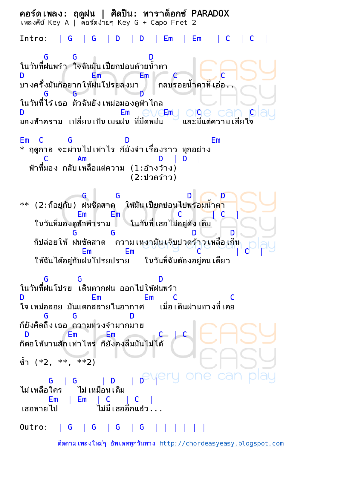 คอร์ดเพลง: ฤดูฝน | ศิลปิน: พาราด็อกซ์ PARADOX | คอร์ดง่ายๆ Key G | เนื้อร้อง / อิทธิพงศ์ กฤดากร ณ อยุธยา(ต้า) | ทำนอง / อิทธิพงศ์ กฤดากร ณ อยุธยา(ต้า) | เรียบเรียง / Producer : Paradox
