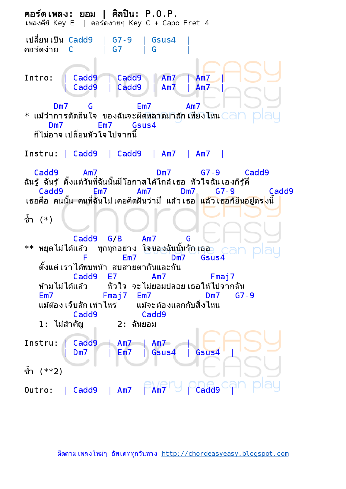 คอร์ดเพลง: ยอม | ศิลปิน: P.O.P. | คอร์ดง่ายๆ Key C | คอร์ดเพลง ยอม | Ukulele | เนื้อร้อง | เนื้อเพลง ยอม | P.O.P.