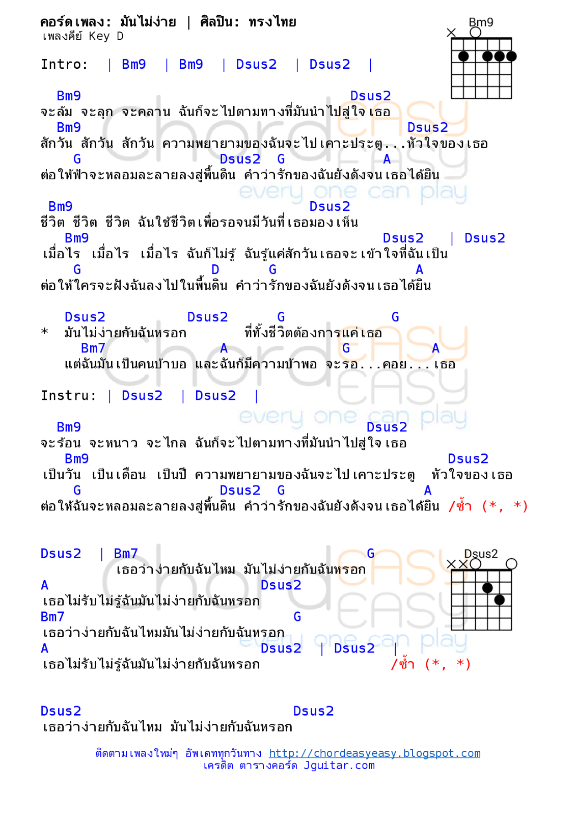 ********************************************************** เปลี่ยนเป็นคอร์ดง่ายๆ | Bm7 | Bm9 | Dsus2 | | Bm | Bm | D | ********************************************************** Intro: | Bm9 | Bm9 | Dsus2 | Dsus2 | Bm9 Dsus2 จะล้ม จะลุก จะคลาน ฉันก็จะไปตามทางที่มันนำไปสู่ใจเธอ Bm9 Dsus2 สักวัน สักวัน สักวัน ความพยายามของฉันจะไปเคาะประตู...หัวใจของเธอ G Dsus2 G A ต่อให้ฟ้าจะหลอมละลายลงสู่พื้นดิน คำว่ารักของฉันยังดังจนเธอได้ยิน Bm9 Dsus2 ชีวิต ชีวิต ชีวิต ฉันใช้ชีวิตเพื่อรอจนมีวันที่เธอมองเห็น Bm9 Dsus2 | Dsus2 เมื่อไร เมื่อไร เมื่อไร ฉันก็ไม่รู้ ฉันรู้แค่สักวันเธอจะเข้าใจที่ฉันเป็น G D G A ต่อให้ใครจะฝังฉันลงไปในพื้นดิน คำว่ารักของฉันยังดังจนเธอได้ยิน Dsus2 Dsus2 G G * มันไม่ง่ายกับฉันหรอก ที่ทั้งชีวิตต้องการแค่เธอ Bm7 A G A แต่ฉันมันเป็นคนบ้าบอ และฉันก็มีความบ้าพอ จะรอ...คอย...เธอ Instru: | Dsus2 | Dsus2 | Bm9 Dsus2 จะร้อน จะหนาว จะไกล ฉันก็จะไปตามทางที่มันนำไปสู่ใจเธอ Bm9 Dsus2 เป็นวัน เป็นเดือน เป็นปี ความพยายามของฉันจะไปเคาะประตู หัวใจของเธอ G Dsus2 G A ต่อให้ฉันจะหลอมละลายลงสู่พื้นดิน คำว่ารักของฉันยังดังจนเธอได้ยิน Dsus2 Dsus2 G G * มันไม่ง่ายกับฉันหรอก ที่ทั้งชีวิตต้องการแค่เธอ Bm7 A G A แต่ฉันมันเป็นคนบ้าบอ และฉันก็มีความบ้าพอ จะรอ...คอย...เธอ Dsus2 Dsus2 G G * มันไม่ง่ายกับฉันหรอก ที่ทั้งชีวิตต้องการแค่เธอ Bm7 A G A แต่ฉันมันเป็นคนบ้าบอ และฉันก็มีความบ้าพอ จะรอ...คอย...เธอ Dsus2 | Bm7 G เธอว่าง่ายกับฉันไหม มันไม่ง่ายกับฉันหรอก A Dsus2 เธอไม่รับไม่รู้ฉันมันไม่ง่ายกับฉันหรอก Bm7 G เธอว่าง่ายกับฉันไหมมันไม่ง่ายกับฉันหรอก A Dsus2 | Dsus2 | เธอไม่รับไม่รู้ฉันมันไม่ง่ายกับฉันหรอก Dsus2 Dsus2 G G * มันไม่ง่ายกับฉันหรอก ที่ทั้งชีวิตต้องการแค่เธอ Bm7 A G A แต่ฉันมันเป็นคนบ้าบอ และฉันก็มีความบ้าพอ จะรอ...คอย...เธอ Dsus2 Dsus2 G G * มันไม่ง่ายกับฉันหรอก ที่ทั้งชีวิตต้องการแค่เธอ Bm7 A G A แต่ฉันมันเป็นคนบ้าบอ และฉันก็มีความบ้าพอ จะรอ...คอย...เธอ Dsus2 Dsus2 เธอว่าง่ายกับฉันไหม มันไม่ง่ายกับฉันหรอก