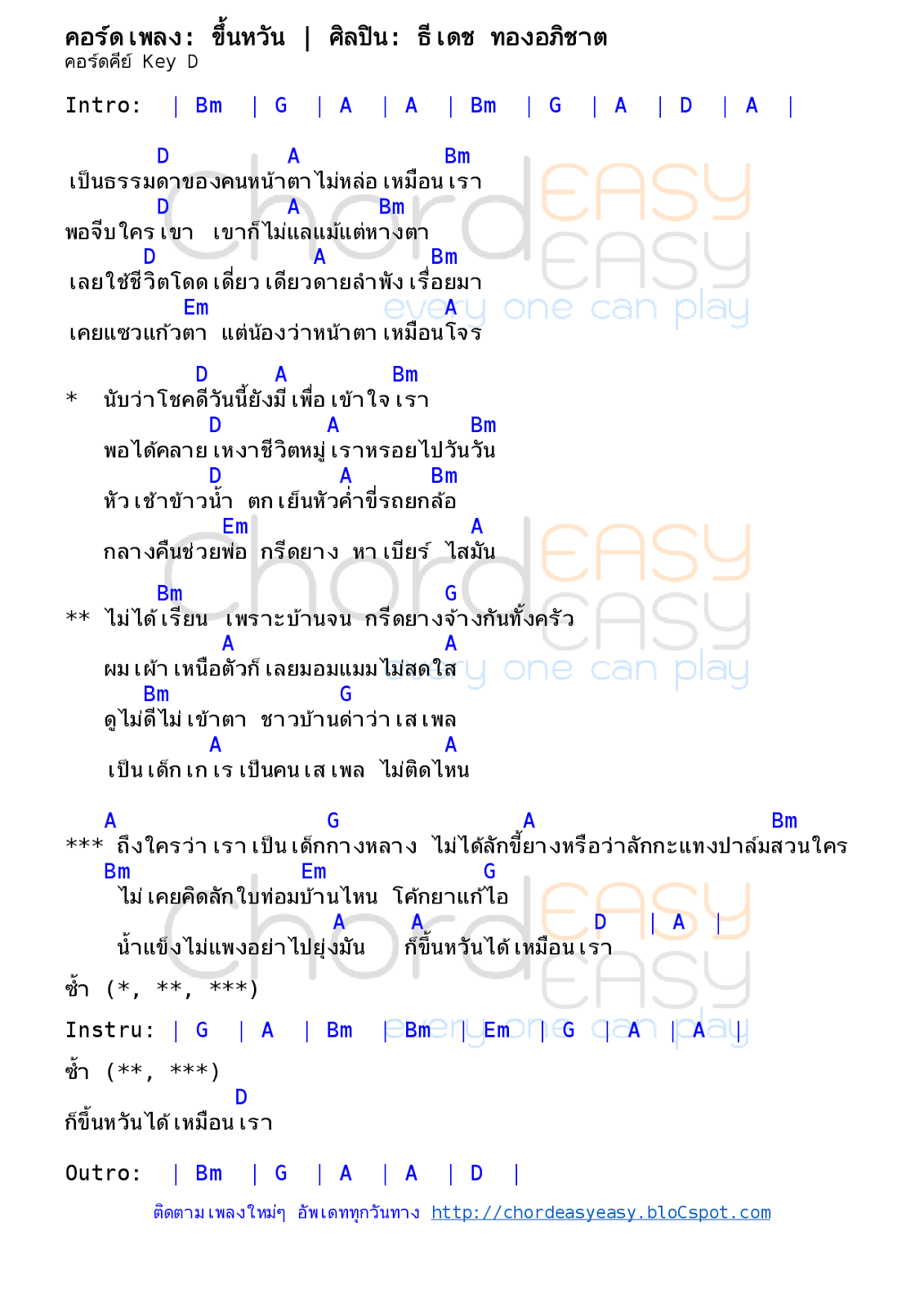คอร์ดเพลง: ขึ้นหวัน | ศิลปิน: ธีเดช ทองอภิชาติ | คอร์ดง่ายๆ Key C |