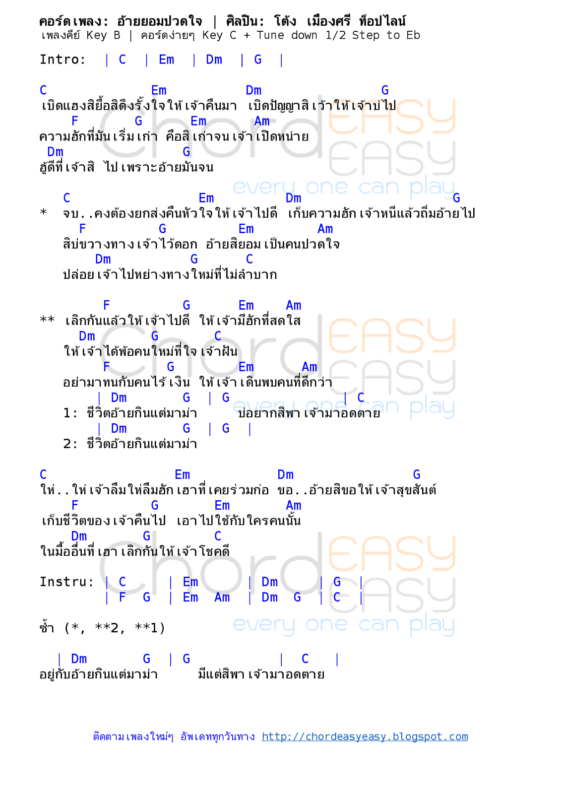 คอร์ดเพลง: อ้ายยอมปวดใจ | ศิลปิน: โต้ง เมืองศรี ท็อปไลน์ | คอร์ดง่ายๆ Key C | เคำร้อง/ทำนอง - เดฟ เดียวดาย | ดนตรี/เรียบเรียง - เอ็ม ข้าวหลาม | คอร์ดเพลง อ้ายยอมปวดใจ |