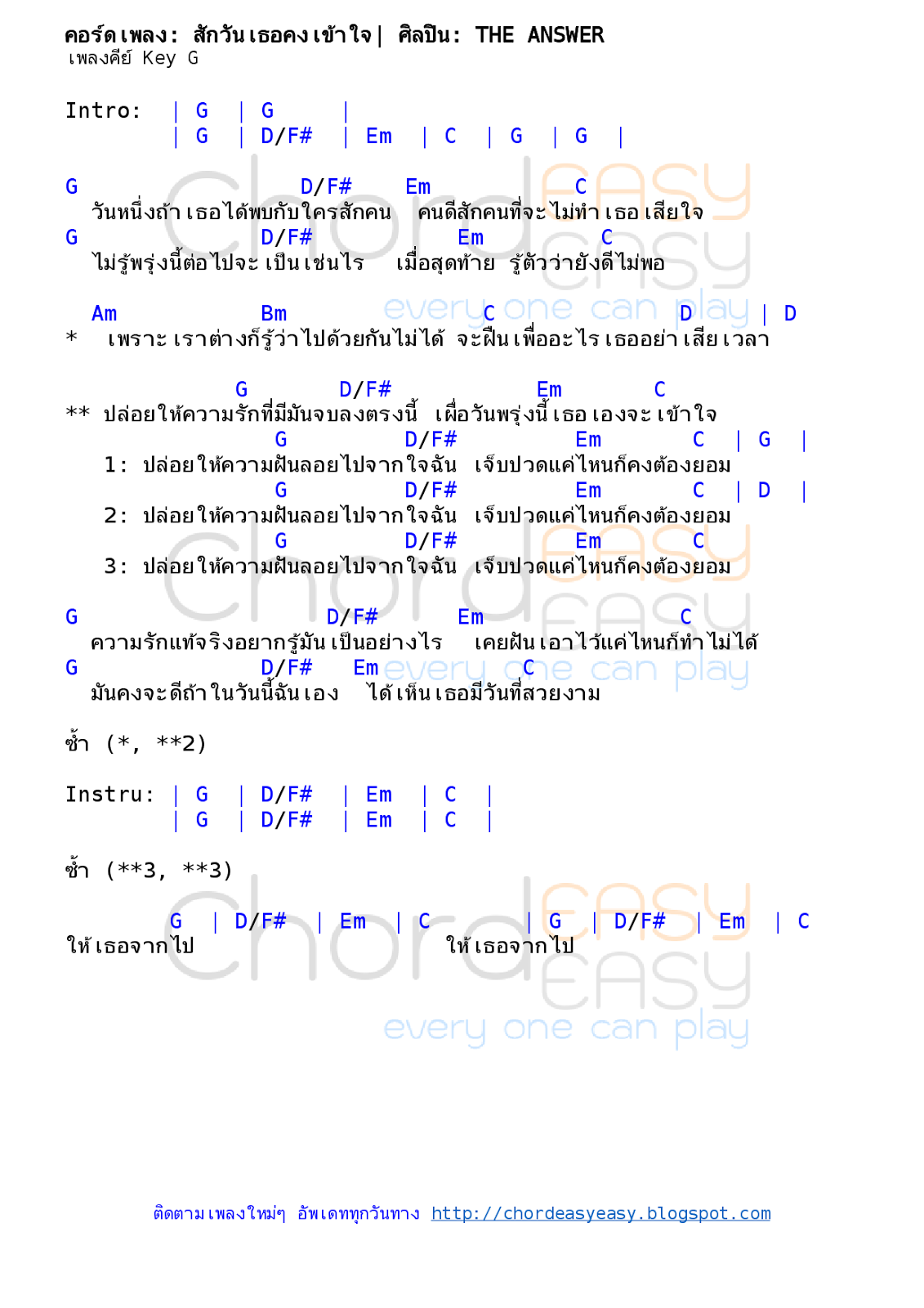 คอร์ดเพลง: สักวันเธอคงเข้าใจ (YOU MIGHT GET IT) | ศิลปิน: THE ANSWER | คอร์ดง่ายๆ Key G |